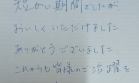 ライフデリ伊東店へのお手紙をご紹介します。 「ありがとうございました。とてもおいしかったです。」とのことです。 スポットでご利用いただいているお客様から美味しかったとお褒めのお手紙を頂きました。またのご注文をお待ちしてお…