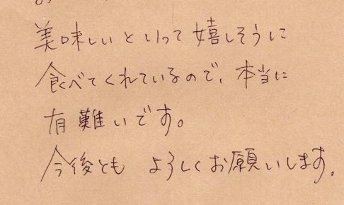 ライフデリ岡山東店へのお手紙をご紹介します。 「お世話になっております。 美味しいといって嬉しそうに食べてくれるので、本当に有難いです。今後ともよろしくお願いします。」とのことです。 以前は他社のお弁当を利用されていたお…