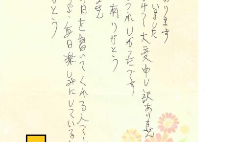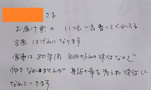 ライフデリ紀の川・岩出・泉佐野店 へのお手紙をご紹介します。 「『いつも配達して下さるお姉さんありがとうね! —-様(店長名) お届け票のいつも一言書いてくれてる言葉はげみになります。 食事は80年間自分好み…