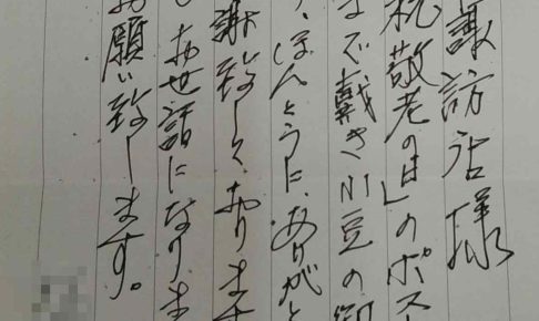 ライフデリ諏訪店へのお手紙をご紹介します。 「昨日は「祝敬老の日」のポストカードと寿万頭まで頂き小豆の御飯でお祝いして下さり、ほんとうにありがとう御座居ました。感謝致しております。これからもお世話になりますが、よろしくお…