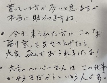 ライフデリ加古川・高砂店へのお手紙をご紹介します。 「8月10日ホームヘルパーの日は知りませんでした。私等のような年になるとヘルパーさんに来てもらっている方が多いと思いますが本当に助かりますね。 今日来られた方にこの「お…