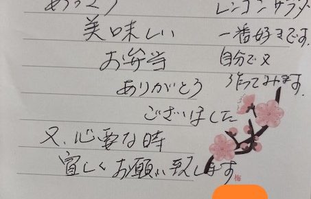 ライフデリ加古川・高砂店へのお手紙をご紹介します。 「お弁当のお届け、ありがとうございます。 お届け票の8/19(土)に、日々食欲がない私に、何気ない心のふれあいを感じました、何気ない心のふれあいを感じました。ありがとう…