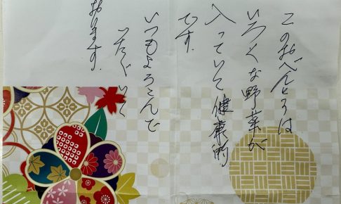 ライフデリ豊島店へのお手紙をご紹介します。 「おいしくいただきました!! 何種類ものお野菜がいただけて幸せです。」とのことです。 ケアマネージャー様からのご紹介で、栄養バランス強化の目的で始まりました。ご試食の際にいただ…