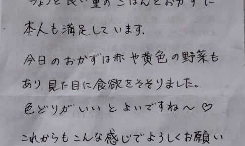 ライフデリ小郡店へのお手紙をご紹介します。 「毎日ありがとうございます。 ちょうど良い量のごはんとおかずに本人も満足しています。今日のおかずは赤や黄色の野菜もあり見た目に食欲をそそりました。 色どりがいいとよいですね。 …