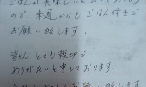 ライフデリ横浜川崎店へのお手紙をご紹介します。 「ごはんがおいしく、我々が親切に接している事への感謝のお手紙をいただきました。」とのことです。 ごはんがとてもおいしく、今後も白米のセットで配達してほしいということでした。…
