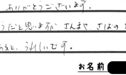 ライフデリ彦根店へのお手紙をご紹介します。 「いつもていねいにお声かけして頂いてありがとうございます。来年もよろしくお願い致します。」とのことです。 オープン当初から昼食利用のお客様です。 普段は奥で横になっておられる事…