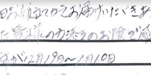 ライフデリ彦根店へのお手紙をご紹介します。 「毎日お献立てを変えてお届けいただきありがとうござきます。 毎日楽しみでした。皆様の力添えのお陰で感謝しております。 まことに勝手ですが12/19-1/10の間はお休みさせてい…
