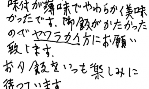 ライフデリ彦根店へのお手紙をご紹介します。 「今日はお気遣い頂き有難うございました。 味付けが薄味でやわらかく美味かったです。 御飯がかたかったのでヤワラカイ方にお願い致します。 お夕飯をいつも楽しみに待っています。」と…