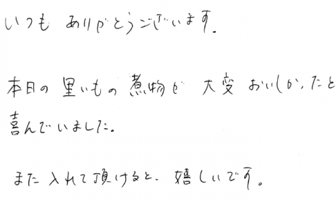 ライフデリ彦根店へのお手紙をご紹介します。 「いつもありがとうございます。 本日の里いもの煮物が大変おいしかったと喜んでいました。 また入れて頂けると、嬉しいです。」とのことです。 オープン当初から継続利用のお客様です。…