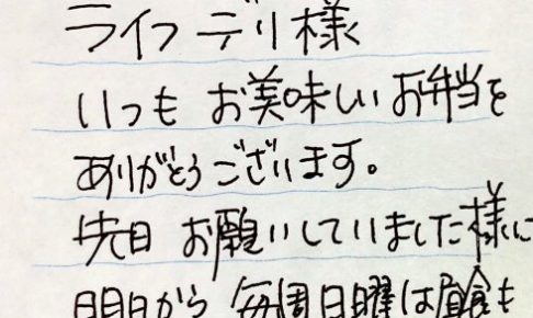 ライフデリ彦根店へのお手紙をご紹介します。 「ライフデリ様 いつも美味しいお弁当をありがとうございます。 先日お願いしていました様に明日から毎週日曜は昼食もお願いします。」とのことです。 プレオープン時から紹介を頂いてい…