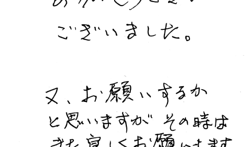 ライフデリ彦根店へのお手紙をご紹介します。 「ライフデリ様 お世話になりありがとうございました。 又、お願いするかと思いますが、 その時はまた宜しくお願いします。」とのことです。 お医者様から健康上の指導を受けたとの事で…
