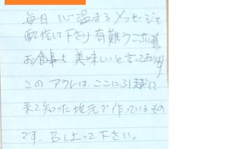 ライフデリ横浜川崎店へのお手紙をご紹介します。 「『おいしかった。ありがとう。』という 感謝のお手紙をいただきました。」とのことです。 お一人で生活されている女性のご利用者様から、 『おいしかった。ありがとう。』という …