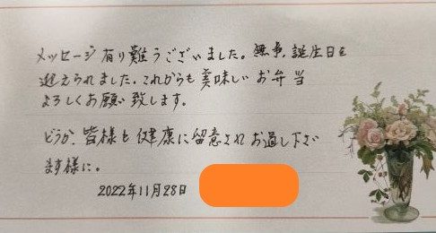 ライフデリ川越・富士見店へのお手紙をご紹介します。 「メッセージ有り難うございました。無事誕生日を迎えられました。これからも美味しいお弁当よろしくお願い致します。」とのことです。 ご夫婦で週4回ご利用していただいているお…