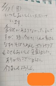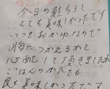 ライフデリ川越・富士見店へのお手紙をご紹介します。 「とてもおいしかったです。オイシイ、オイシイ、オイシイおいしかったです。よろしく」とのことです。 ケアマネさんからのご紹介で、お昼と夕食を毎日お届けしています。事前のご…