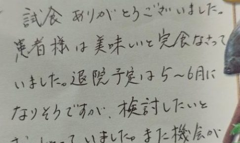 ライフデリ川越・富士見店へのお手紙をご紹介します。 「試食ありがとうございました。患者様は美味しいと完食なさっていました。退院予定は5~6月になりそうですが、検討したいとおっしゃっていました。」とのことです。 病院の管理…