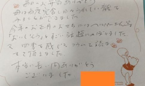 ライフデリ川越・富士見店へのお手紙をご紹介します。 「毎日のお弁当ありがとう。母は毎度完食しうれしい顔をみることができました。今年のお正月のおせちにはヘルパーさん等「おいしそう」とすごい話題にのぼりました又四季を感じるコ…