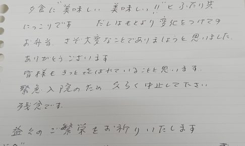 ライフデリ目黒店へのお手紙をご紹介します。 「入所の為中止となりましたが今までありがとうございました。」とのことです。 5年以上ご注文頂いている方で先日ご入所の為終了になりました。その間部屋で倒れていたり色々有りましたが…