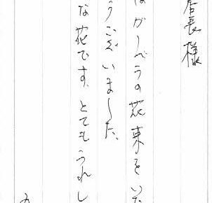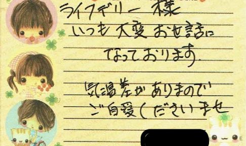 ライフデリ福岡西店へのお手紙をご紹介します。 「ライフデリ―様 いつも大変お世話になっております。 気温差がありますのでご自愛くださいませ というお手紙を頂戴しました。」とのことです。 ご両親様の健康を心配されているお嬢…
