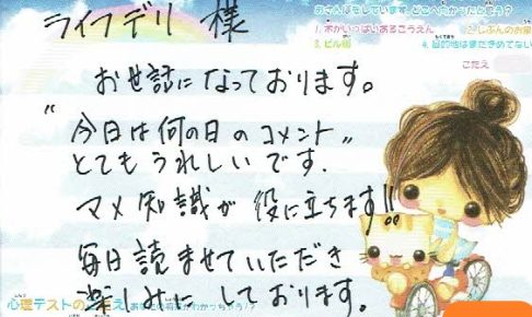 ライフデリ福岡西店へのお手紙をご紹介します。 「今日は何の日コメント とても嬉しいです。豆知識が約に立ちます!!というお手紙を頂戴致しました。」とのことです。 ご両親様の健康状態を心配されいらっしゃるお嬢様より、献立表に…