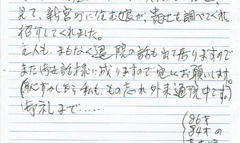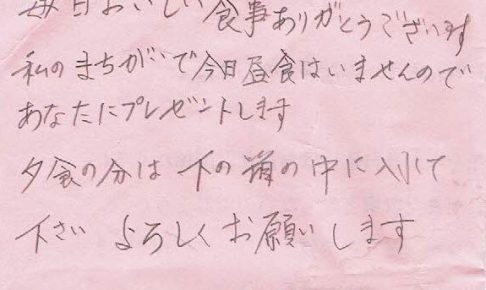 ライフデリ福岡西店へのお手紙をご紹介します。 「お世話になります。8日昼食から完食していました。安心しました。よろしくお願いします。何かありましたらご連絡ください。というお手紙を頂戴しました。」とのことです。 お一人暮ら…
