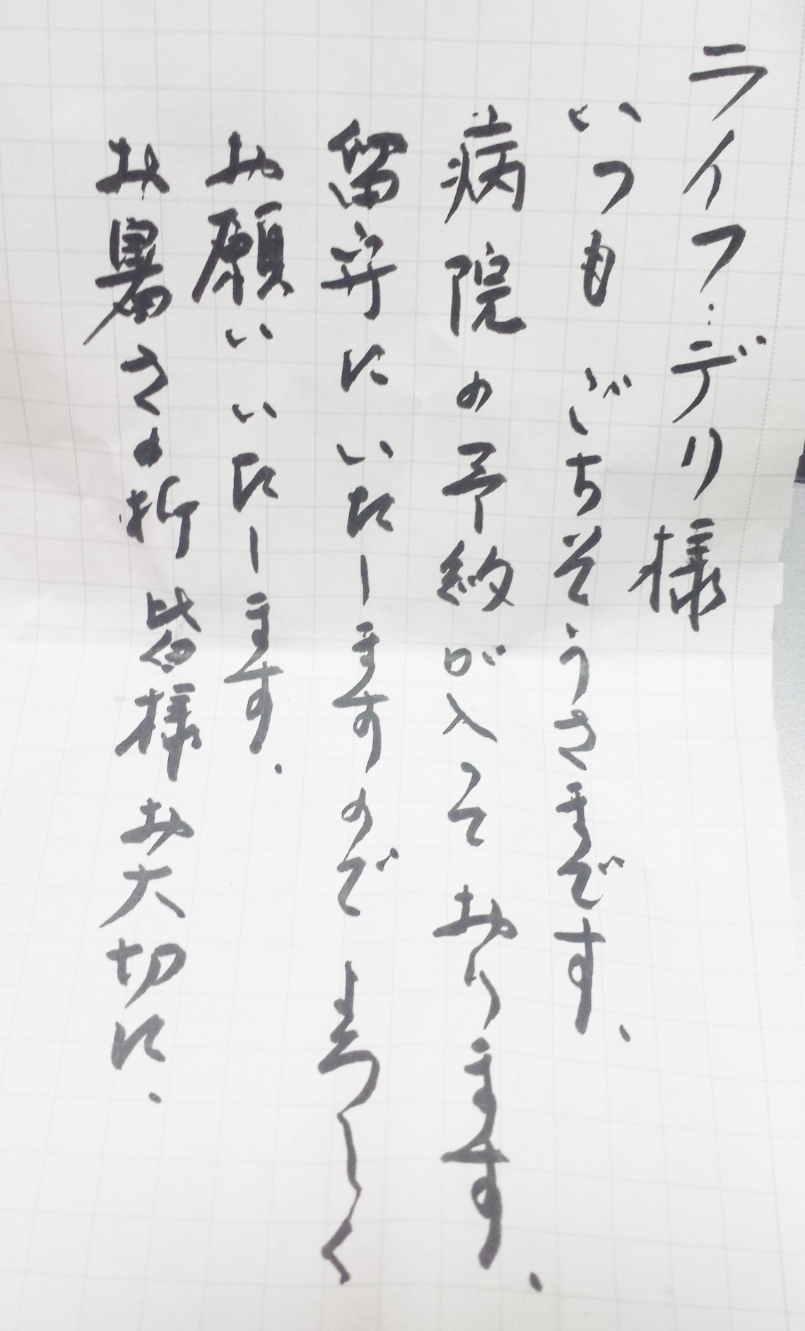 ライフデリ大田店へお手紙を頂戴しました。 通院で不在の際のご伝言と暑い中の配達への労いのお言葉を頂戴しました。ありがとうございます。 ライフデリではご利用者様が健康で暑い夏を乗りきれるよう、栄養バランスに配慮したお弁当と…