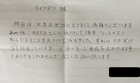 ライフデリ川越・富士見店へのお手紙をご紹介します。 「昨日は大変お世話になりまして有難うございます あの後ケアマネさんに訪問していただき、ベッドの下に 転んでいるところを見つけて頂きました。幸いケガなどはなく経過していま…