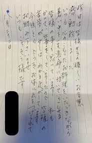 ライフデリ昭島・あきる野・福生店へのお手紙をご紹介します。 「昨日は誕生日の嬉しいお言葉感動致しました。 いつも心のこもったお料理を頂きながら、暑い中を一生懸命に働いている皆様のことを思っています。 今後ともお体に気をつ…