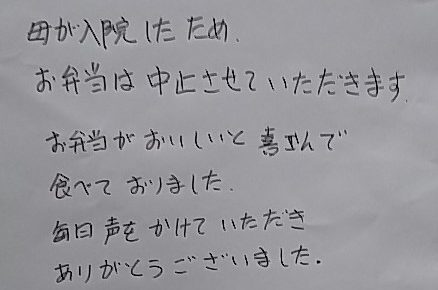ライフデリ周南店へのお手紙をご紹介します。 「いつもお世話になります。母が入院したため、お弁当は中止させていただきます。お弁当がおいしい喜んで食べておりました。毎日声をかけていただきありがとうございました。元気になること…