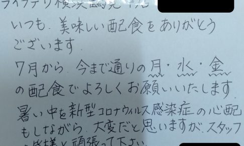 ライフデリ横浜鶴見・中店へのお手紙をご紹介します。 「配食の日程変更のご連絡でしたが、コロナを気にしながらの業務を気遣っていただいた内容で、大変うれしいお手紙でした。」とのことです。 配食スケジュールの変更を伝えるメモで…