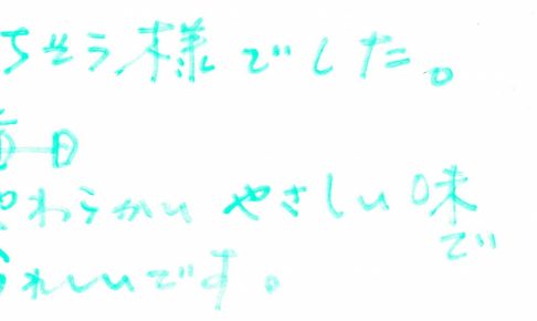 ライフデリ諏訪店へのお手紙をご紹介します。 「「ごちそう様でした。毎日やわらかい やさしい味で うれしいです。」」とのことです。 ご試食後、ご新規でお取り頂き1週間ほど経った頃に、ご家族様から、うれしいお手紙を頂戴いたし…