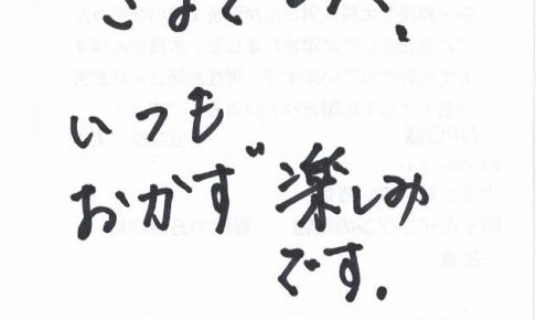 ライフデリ岡山中央店へのお手紙をご紹介します。 「ごちそうさまでした。毎日おかずが楽しみです!!」とのことです。 お一人暮らしで、自分で買うなどでは好きなものばかり食べてバランスがよくないため、お弁当を始められました。あ…