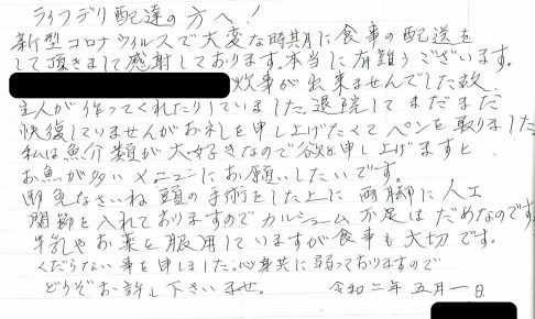 ライフデリ宮崎店へのお手紙をご紹介します。 「「ライフデリの配達の方へ 新型コロナウイルスで大変な時期に食事の配送をして頂きまして感謝しております。本当にありがとうございます」というお手紙を頂戴しました。」とのことです。…
