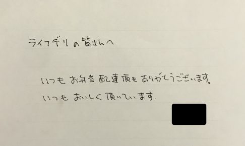 ライフデリ霧島店へのお手紙をご紹介します。 「毎日宅食をお届け頂き有難うございます お陰様で助かっております お体に気をつけて 頑張ってお働き下さいます様に」とのことです。 先月より契約になったお客様で、ご不在でしたが回…