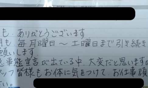 ライフデリ横浜鶴見・中店へのお手紙をご紹介します。 「来月の予定を教えていただきました。 また、緊急事態宣言の中頑張ってくださいとの激励のお言葉でした。」とのことです。 来月の予定を教えていただきました。 また、緊急事態…