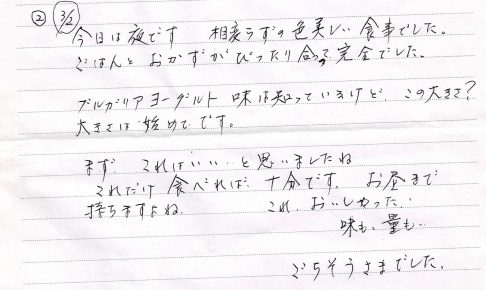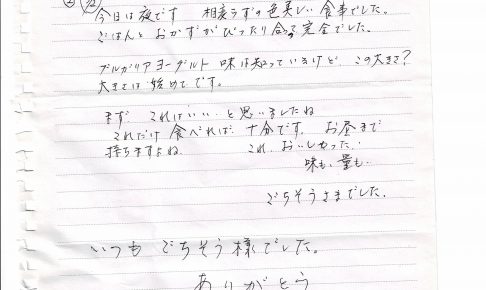 ライフデリ川崎本店へのお手紙をご紹介します。 「ごはんとおかずがぴったり合って完全でした。いつもごちそう様でした。ありがとう」とのことです。 ご体調を崩され息子様よりお電話を頂戴し昼食、夕食と2回配達をしているご利用者様…