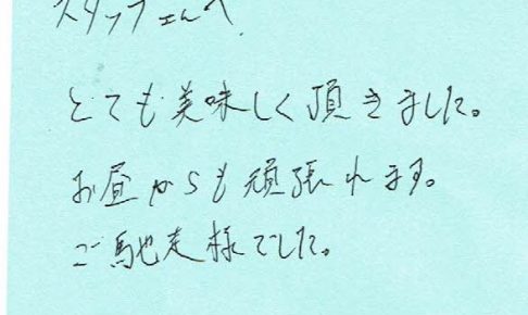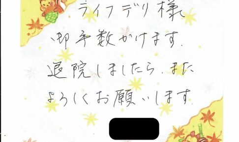 ライフデリ宮崎店へのお手紙をご紹介します。 「「ライフデリ様 お手数掛けます 退院しましたらまたよろしくお願いします。」というお手紙を頂戴しました。」とのことです。 毎週定期的に配達していたお客様ですが、入院のため当面休…