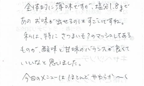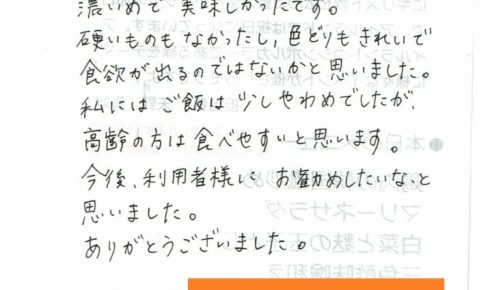 ライフデリ宮崎店へのお手紙をご紹介します。 「「美味しくいただきました、ありがとうございます。全体的に薄味ですが、塩分1.8gであのお味がでるのはすごいですね。機会があればご利用者様におすすめしますね。」というお手紙を頂…