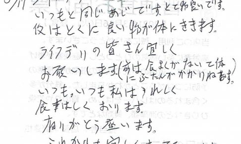 ライフデリ諏訪店へのお手紙をご紹介します。 「良い物が体にききます。いつもうれしく食事をしております。有りがとうご座います。」とのことです。 ケアマネ様からご紹介頂き、昼夕と8ヶ月お取り頂いております。耳が遠いので普段は…