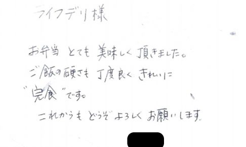 ライフデリ近江八幡・彦根店へのお手紙をご紹介します。 「ライフデリ様 お弁当とても美味しく頂きました。 ご飯の硬さも丁度良くきれいに ”完食”です。 これからもどうぞよろしくお願いします。 」とのことです。 当店、第一号…