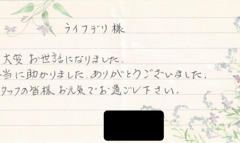 ライフデリ川崎本店へのお手紙をご紹介します。 「ライフデリ様 大変お世話になりました。 本当に助かりましたありがとうございました。 スタッフの皆様お元気でお過ごしください。というお手紙を頂戴致しました。」とのことです。 …