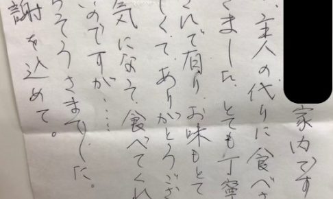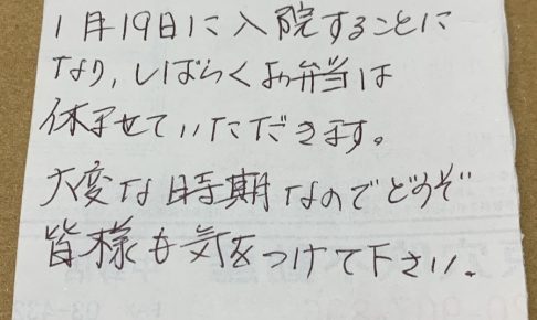 ライフデリ中野店へのお手紙をご紹介します。 「ライフデリ中野店様 いつもお弁当をありがとうございます。 1月19日に入院することになり、しばらくお弁当は休ませていただきます。 大変な時期なのでどうぞ皆様も気をつけて下さい…