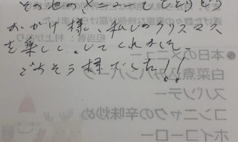 ライフデリ中野店へのお手紙をご紹介します。 「12月24日クリスマスのイブに白菜煮込みハンバーグが夕食に食べられるとは思いませんでした。 とても珍味のハンバーグにメリークリスマス! その他のメニューも色とりどり、 おかげ…