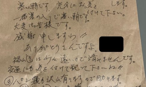ライフデリ霧島店へのお手紙をご紹介します。 「お早うございます お弁当配達有難う存じます。 おいしく戴いております。 2月いっぱいは毎日下さいませ。 よろしゅうにお頼みします。 寒い朝です、充分にお気を付けて下さい。 一…