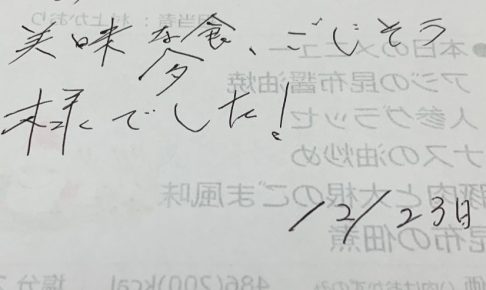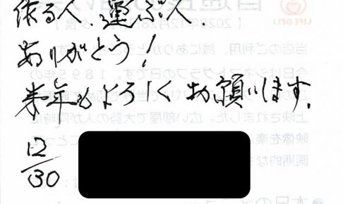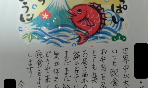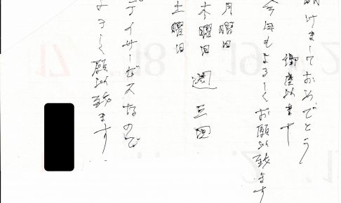 ライフデリ福岡西店へのお手紙をご紹介します。 「おめでとうございます。今年もよろしく。今日夕方帰ります」とのことです。 昨年よりお食事を召し上がっている方で、外出されるのでそのお知らせのお手紙をいただきました。当店では外…