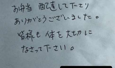 ライフデリ西濃安八店へのお手紙をご紹介します。 「年末年始 休まず お弁当配達して下さり ありがとうございました。 皆様も体を大切になさって下さい。 というお手紙を頂戴しました。」とのことです。 昨年の7月に奥様が退院さ…