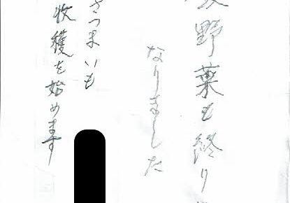 ライフデリ福岡西店へのお手紙をご紹介します。 「夏野菜も終わりました 次はさつまいもの収穫をはじめますというお手紙をいただきました。」とのことです。 週3回のお食事を楽しみにいただいている方で難聴があるため普段はお手紙に…