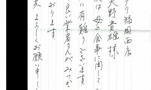 ライフデリ福岡西店へのお手紙をご紹介します。 「このたびは母の食事に関して御便宜いただき誠に有難うございます、というお手紙をいただきました。」とのことです。 ケアマネージャー様からの紹介でムース食の試食をお届けしたところ…