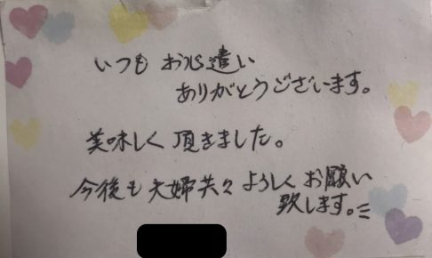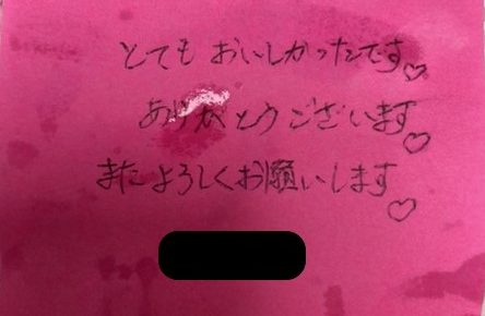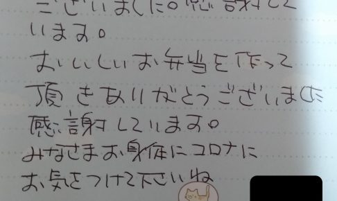 ライフデリ加古川店へのお手紙をご紹介します。 「食後綺麗に洗った弁当箱の中に、ごちそうさまでした」とのことです。 1人暮らしの女性で、弁当の到着を楽しみに待っていてくださいます。 気持ちを伝えたいと、メモを入れてください…