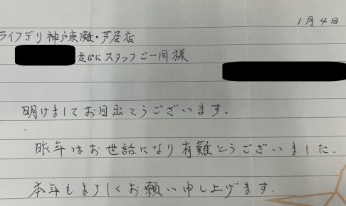 ライフデリ芦屋・神戸東灘店へのお手紙をご紹介します。 「新年のご挨拶 本年もよろしくお願い申し上げます。」とのことです。 以前、一緒に働いていたスタッフのご両親で他社を利用されていたがスタッフの引っ越しを機に安否確認もあ…