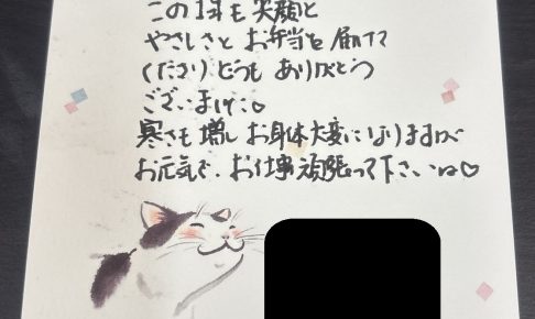 ライフデリ中野店へのお手紙をご紹介します。 「ライフデリ 村上さま この1年も笑顔と やさしさとお弁当を届けて くださりどうもありがとう ございました。 寒さも増しお身体大変になりますが お元気で、お仕事頑張って下さいね…